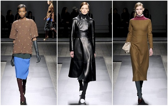 Si abbassano le luci, cala il silenzio nella sala e ha inizio la sfilata. I cappotti over sono sovrapposti a lunghe gonne al ginocchio che lasciano intravedere calzini al polpaccio da indossare con decollete dai colori metallizzati, gli abiti dalle silhouette trapezoidali vengono fasciati con cinture a vita ad alta che suggeriscono una sensualità sobria.